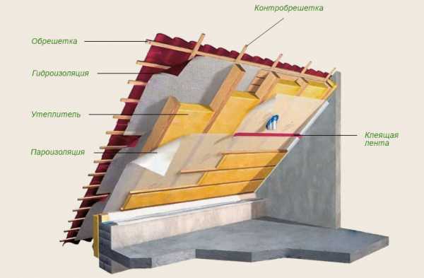 Прежде всего, необходимо обеспечить дополнительную гидроизоляцию и пароизоляцию для чего применяют полиэтиленовую пленку или другие заменители полиэтилена. Для ее крепления используют гвоздики, тоненькие рейки или клеевые составы. Затем монтируют утеплитель в виде блоков. Главные требования к материалу — экологичность, влагостойкость и пожаробезопасность. Чаще всего в качестве утеплителя используют стекловату, минеральную вату, пенопласт (прочитайте: «утепление пенопластом крыши»)..
