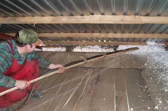 15-20 –сантиметровым слоем на рубероид в промежутки между лагами. Чтобы в теплоизоляционном слое не поселились мыши, опилки следует смешать с известью. Плохо, что такой утеплитель относится к легковоспламеняющимся материалам.