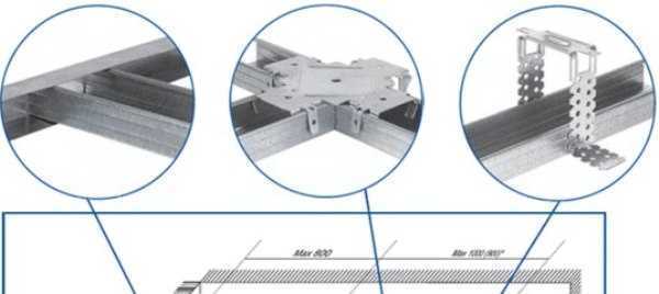 Стойки обладают достаточной жесткостью, чтобы противостоять изгибающим нагрузкам, а вот потолочный профиль благодаря небольшой высоте боковых стенок нуждается в дополнительной фиксации. Для этой цели используются подвесы — прямые и регулируемые.