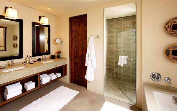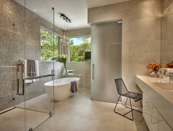 Хромированные детали ванной комнаты, душевая кабина, шторки для ванной отлично дополнят интерьер комнаты со стеклянной дверью.