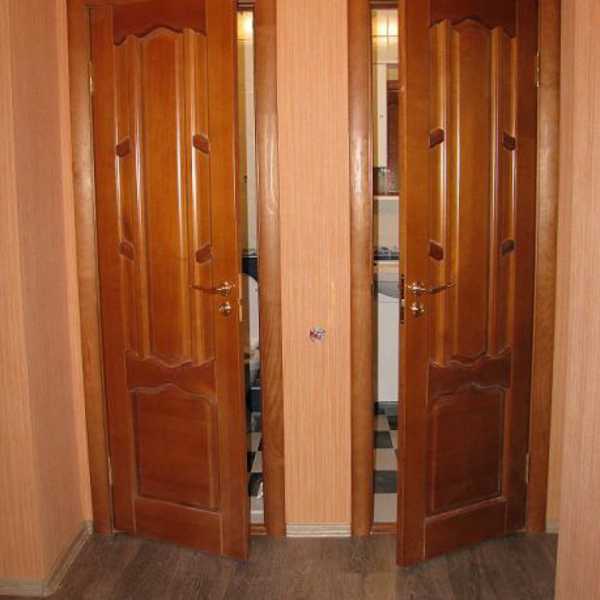 Сантехнические двери из массива также подходят для влажной среды, несмотря на их недолговечность. Обязательным условием становится установка мощной вентиляционной системы, которая быстро высушит помещение, удалит из него влагу.