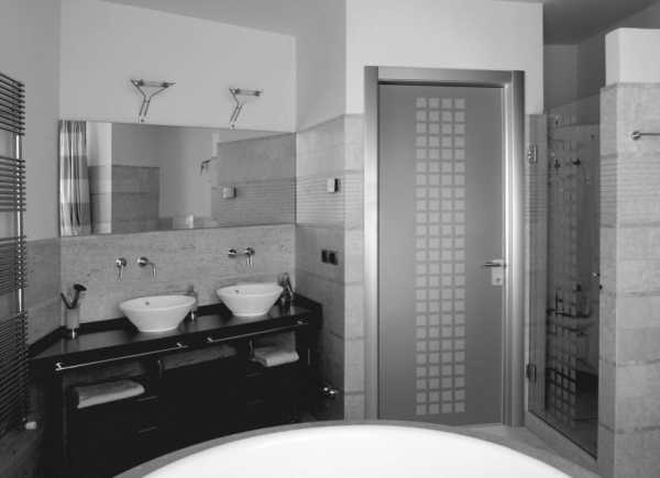 Если же в комнате помимо ванны есть джакузи или сауна, дверь не должна герметично закрываться, обязательно следует внизу полотна делать вентиляцию. Если санузел расположен слишком близко к межкомнатным дверям и есть вероятность, что две двери будут открываться навстречу друг другу, то для ванной комнаты можно выбрать двери-купе.