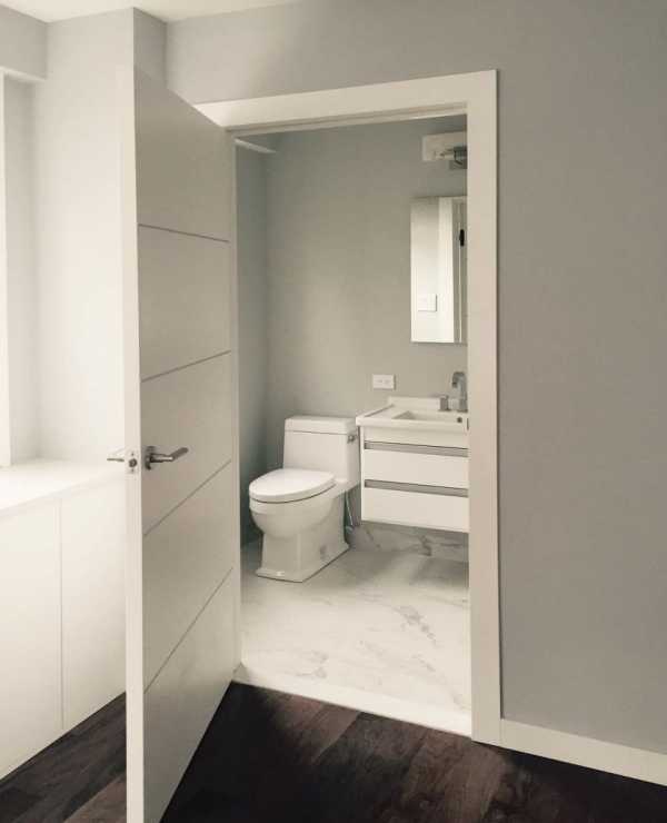 - Для исключения риска затопления делается невысокий порог 5 см, предотвращающий попадание воды в холл. Поэтому размеры дверей в санузел небольшие, а их установка осуществляется выше уровня межкомнатных вариантов.