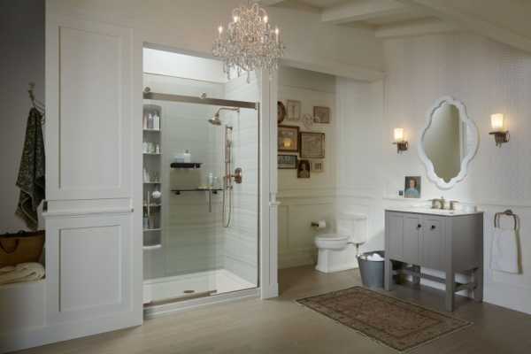 Главный фактор выбора этого типа – свободное место в ванной комнате. Если оно позволяет, можно установить модель на две створки. Этот тип предполагает два варианта формы двери: стандартную и округленную.