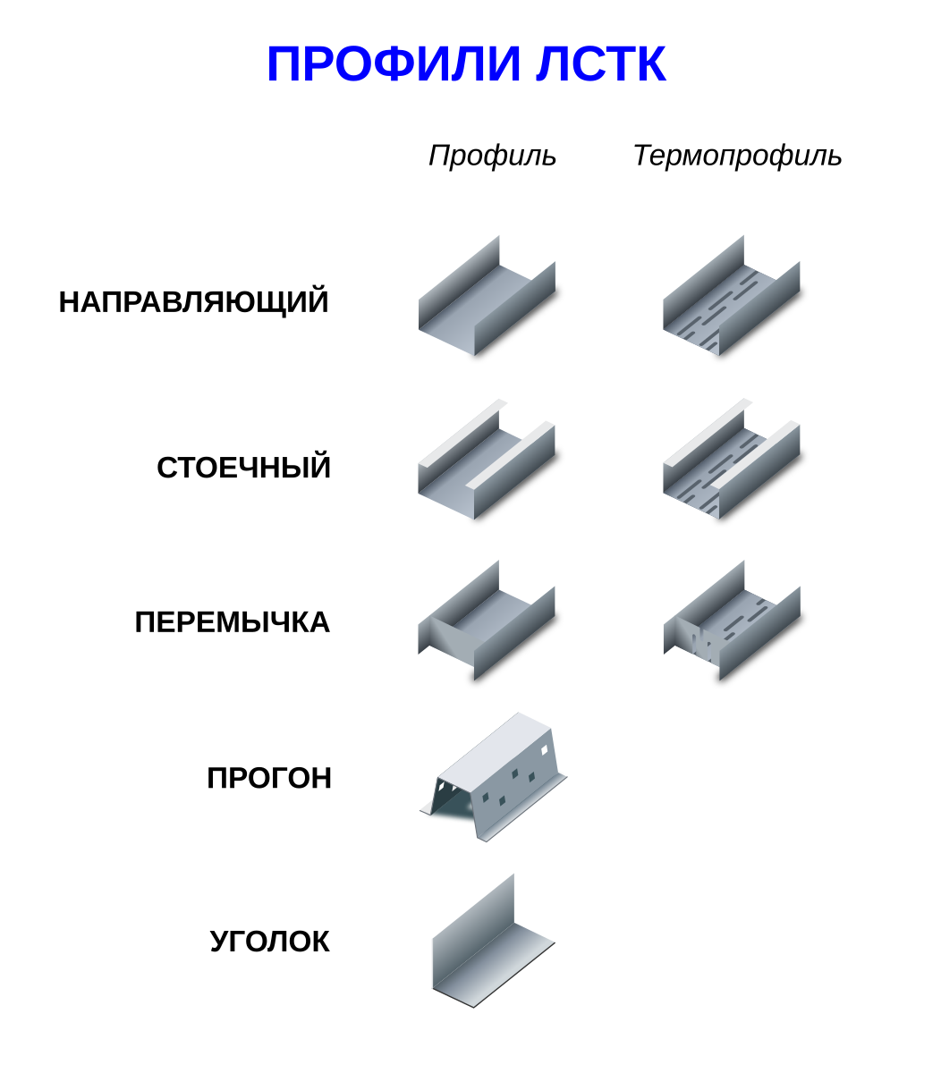 Все разновидности профилей изготавливают из специальной стальной ленты толщиной 0,35÷0,6мм с обязательным оцинкованным покрытием с целью противостояния агрессивным средам.
