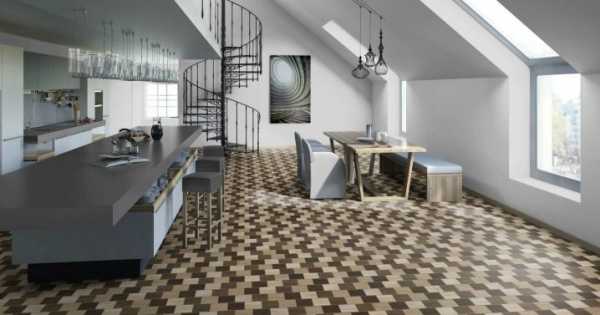 Выстилая такой линолеум легко соблюдать рисунок, что хорошо впишется в композицию кухни. И если пол будет неравномерно изнашиваться, это будет не так выражено для глаза.