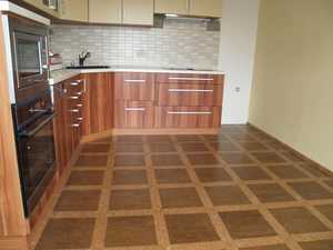 Он не боится огня, самых сильных кухонных загрязнений и агрессивной бытовой химии. Отлично держит тепло и имеет хорошие звукоизолирующие свойства. Все эти свойства роднят его с натуральным пробковым полом (о котором мы уже писали здесь). У него есть, пожалуй, единственный условный минус — цена. Синтетический аналог стоит ощутимо дешевле.