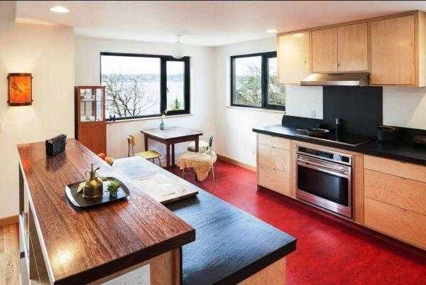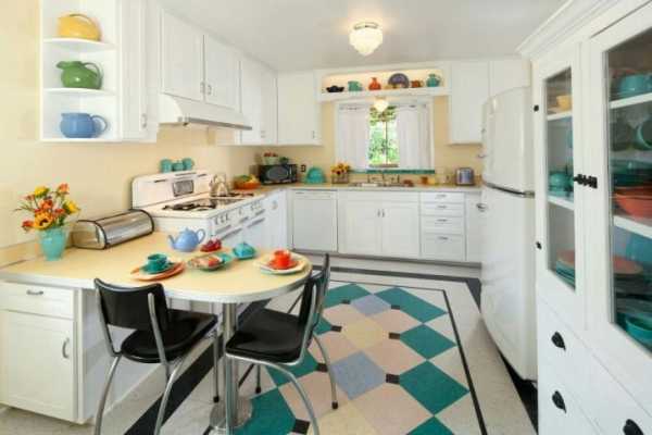 На фото представлены интересные примеры использования линолеума в интерьере современной кухни: