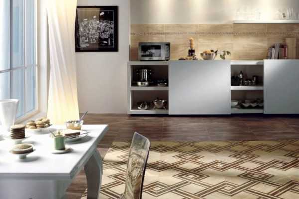 Немалым спросом пользуется и декор линолеума, который имитирует технику маркетри. Так называют мозаику по дереву из различных видов шпона. Весьма неплохо смотрится в интерьере кухни качественный линолеум, имитирующий доску из массива.