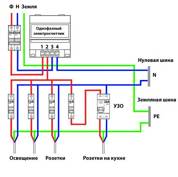 После электросчетчика фазовый провод идет на разветвитель, УЗО и пакетники, отвечающие за включение — выключение отдельных веток электропроводки, нулевой провод выводятся на контактную колодку, от которой проводка разводится по всему дому.
