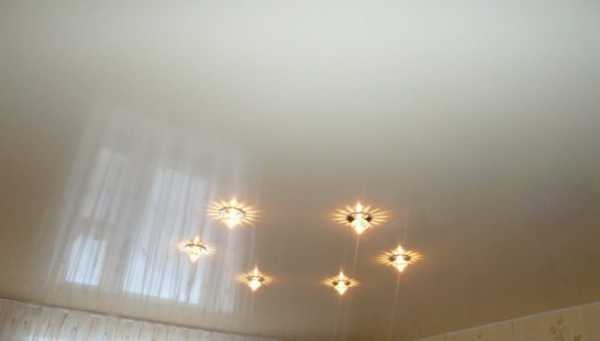 Глянцевые полотна позволяют создать красивые конструкции со встроенными светильниками. Такое покрытие может быть полупрозрачным, что позволяет увеличить мощность освещения на 50%. Это позволяет равномерно осветить всё площадь помещения. В таком случае необходимо установить в потолок длинные люминесцентные лампы или светодиодную ленту. Они позволяют использовать большую площадь для подсветки потолочной поверхности.