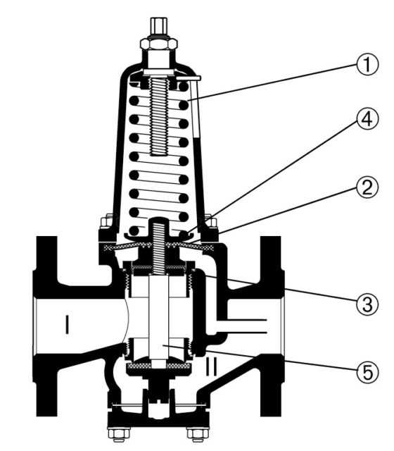 Такие регуляторы содержат систему «мембрана–пружина» (1–2), которая открывает или закрывает регулятор в зависимости от величины давления на выходе из него. Другие узлы регулятора – неподвижное седло (3) и подвижная мембрана (4). Давление на входе действует на камеру I, а давление на выходе – приложено к камере II.