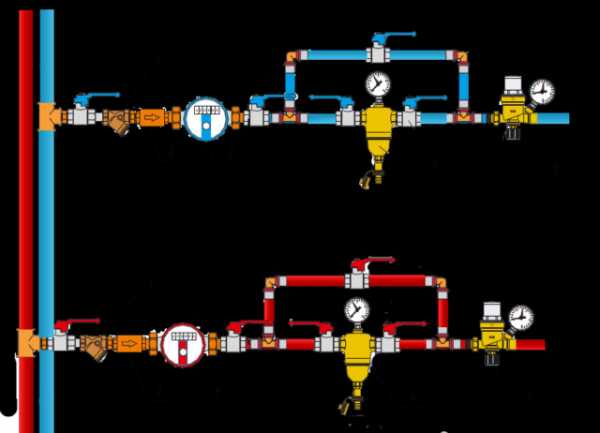 Но при установке до узла учёта должна исключаться любая возможность забора воды, а значит, технические пробки для промывки фильтра и штока окажутся запломбированы, а сам редуктор лишится возможности обслуживания. Этим можно пренебречь, но даже в таком случае очень сложно предусмотреть разное гидродинамическое сопротивление и добиться выравнивания давлений в коллекторах холодной и горячей воды. Нужно либо устанавливать в них дополнительные манометры для более точной подстройки, либо располагать регуляторы давления сразу перед коллекторами, как и поступает большинство опытных сантехников.