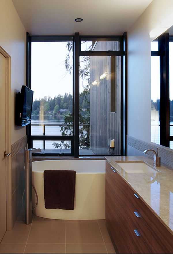 1Глубокая чаша для узкой комнаты, установленная рядом с панорамным окном.