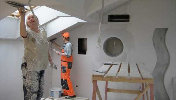 - Потолки и стены штукатурим или обшиваем гипсокартоном