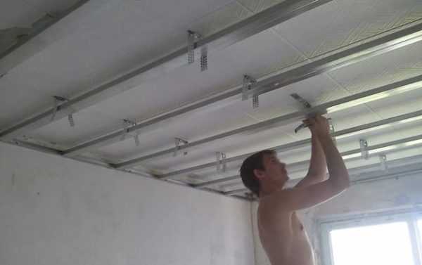 - Замеряют и отрезают несущие профили, размером меньше на 1 см,пристраивают в направляющие и фиксируют ln-креплениями. Подвесы сгибают и привинчивают к профилю. Несущие элементы закрепляют с помощью натянутой нитки, их придерживают, чтобы они были прямыми.