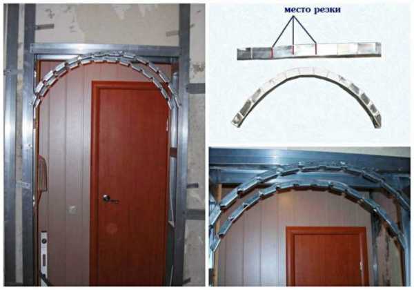 - Наверху проёма дюбелями крепится направляющий металлопрофиль к перекрытию. На боках стен с обеих сторон также устанавливаются подобные элементы, начиная с верхнего угла до окончания закругления свода. Они закрепляются саморезами.