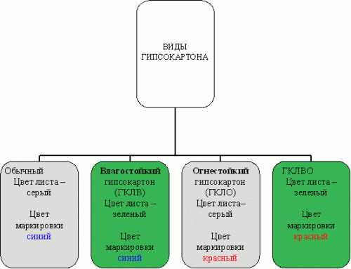 - Для обшивки готового каркаса понадобятся гипсокартонные листы: серые или зелёные, толщиной 12,5 мм и на краях располагающие обширными срезанными фасками. Листы второго цвета – влагостойкие, пригодные для помещений, где наблюдается повышенная влажность.