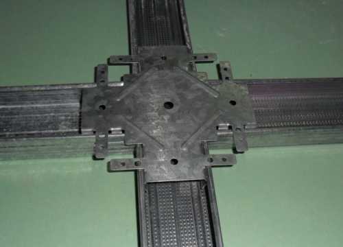 - Соединители профилей. Существует три типа соединительных элементов, без которых монтаж каркаса для гипсокартона просто невозможен. Это прямой cd-соединитель, крестообразный cd-соединитель (в народе называется «краб») и двухуровневый cd-соединитель, используемый для соединения несущих профилей в разных уровнях. Прямой cd-соединитель используется для удлинения несущего профиля, а крабы применяются для крестообразного их соединения.