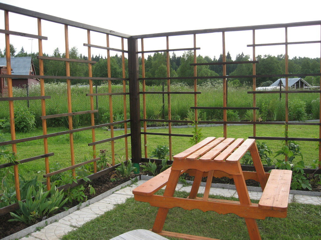 - Арка садовая. Более простое сооружение, состоящее из нескольких последовательно расположенных дуг, и оборудованное небольшой деревянной скамьёй. Соорудить такую конструкцию сможет любой человек, минимально владеющий столярными навыками и имеющий необходимый инструмент.