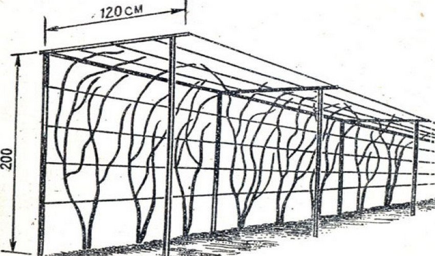 Двухплоскостная пергола сложней при изготовлении. Обычно она применяется для старых больших кустов. С ее помощью можно разнести лозы и обеспечить свободный доступ к ягодам.