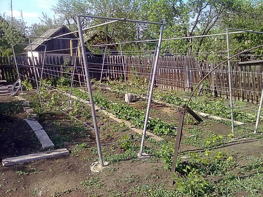 - варианты из проволоки и металла.На опорах натягивается алюминиевая проволока, по которой плетется культура;