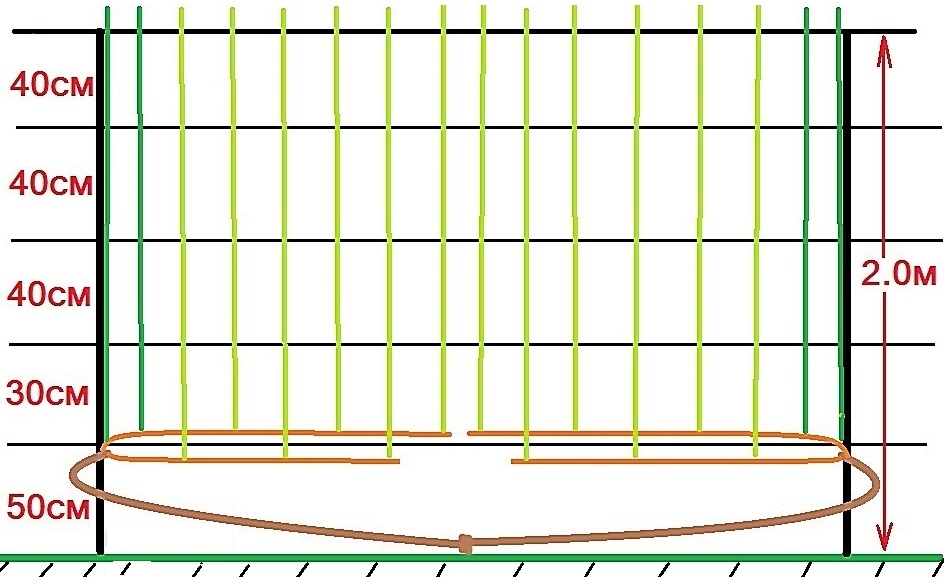 Рис.2. Шпалера для винограда чертеж. Рассчитана на 10-15 лоз (куст 3-5 лет). На первых 3-х перекладинах укладываются прошлогодние горизонтально. К остальным подвязываются молодые вертикально.