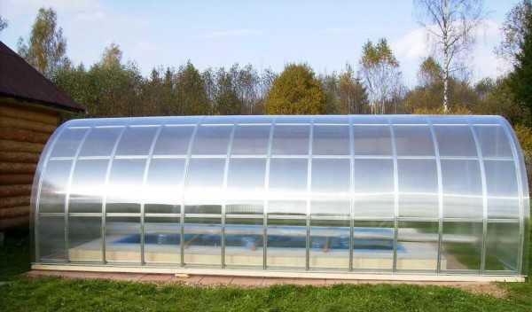 Еще один вариант укрытия для бассейна из поликарбоната. Строится по той же методике, что и беседки