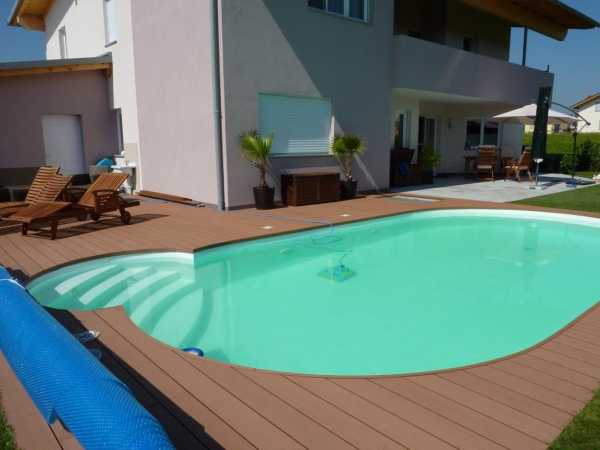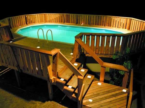 Стационарный каркасный бассейн, окруженный специальным деревянным помостом