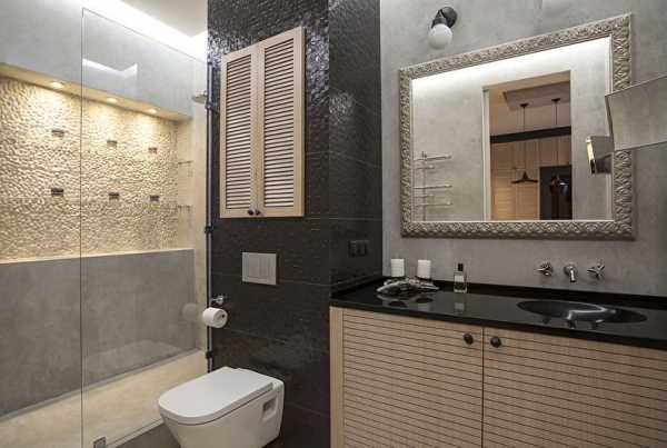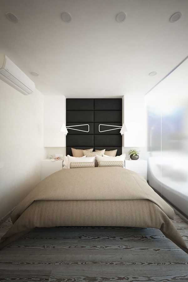 Со стороны спальни она имеет открытую нишу, которая заменяет хозяевам прикроватную тумбу. Еще одна тумба подвешена к стене – под ней можно разместить пуф для экономии пространства.