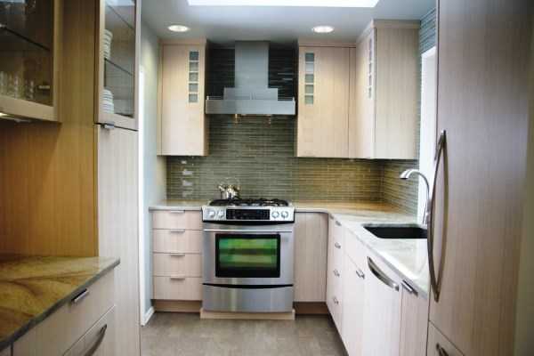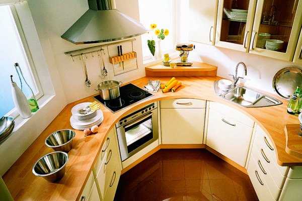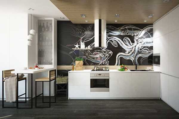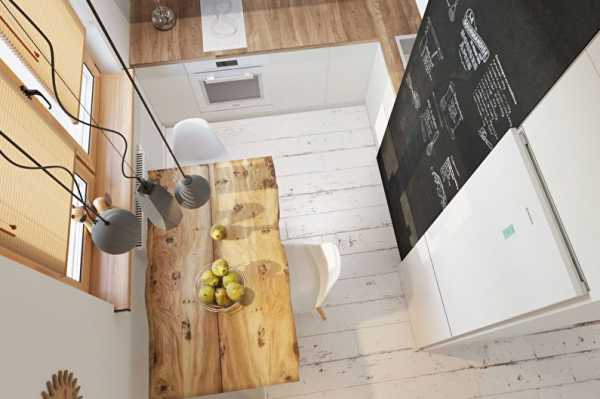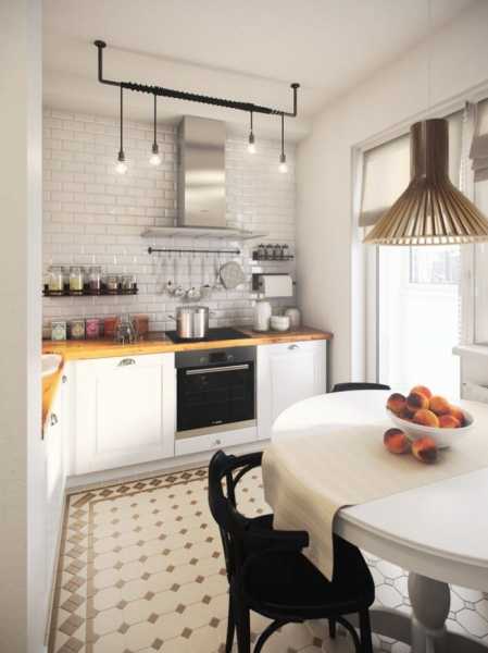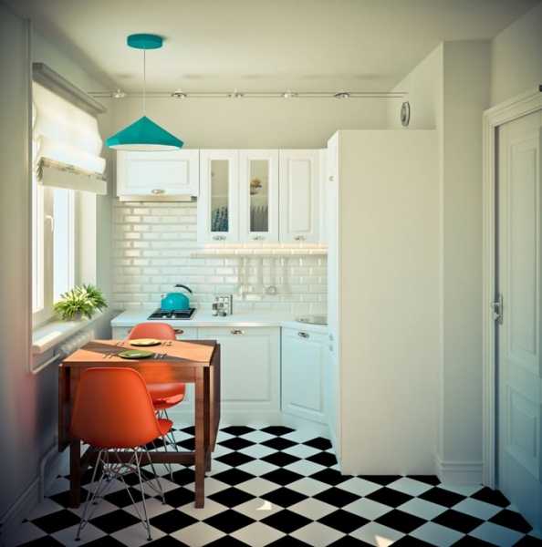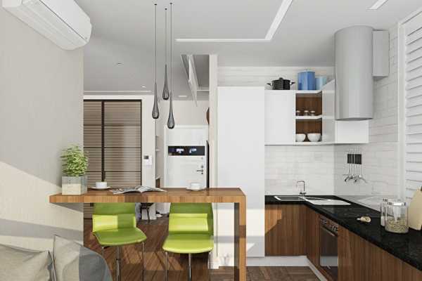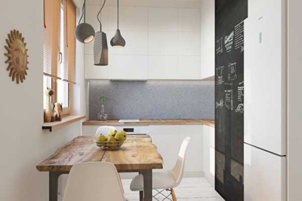 Основной цвет в дизайне маленькой кухни – белый, что делает ее визуально просторнее. Обеденный стол складывается в целях экономии места. Его столешница из натурального дерева смягчает строгую стилистику отделки и делает кухню уютнее.