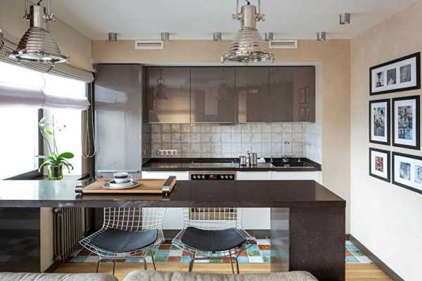 Обеденную зону можно выделить, установив в комнате барную стойку. Барная стойка, которую можно использовать в качестве стола – это отличное решение для молодой пары. Если в гости придут несколько человек, они вполне смогут разместиться за стойкой.