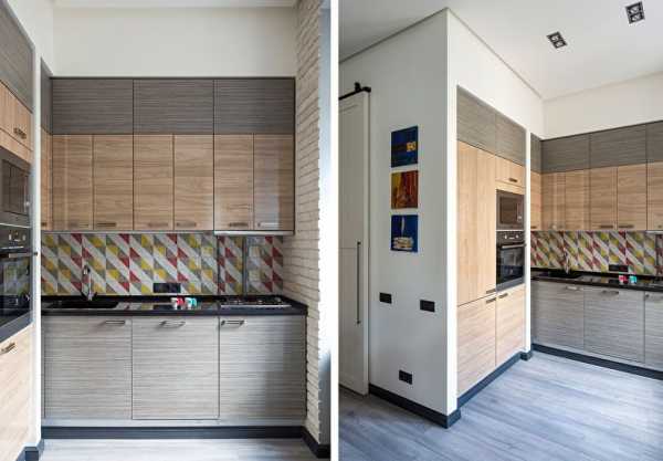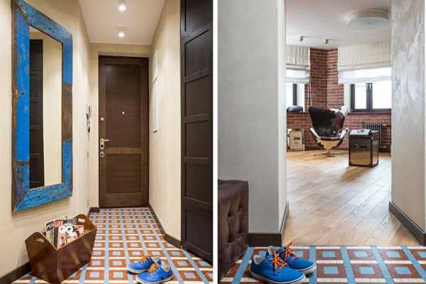 Цветовая палитра построена на контрасте приглушенных и ярких оттенков. Рисунок пола помогает в зонировании пространства, выделяя каждую зону. Несмотря на небольшие размеры, интерьер выглядит стильно и эстетично.