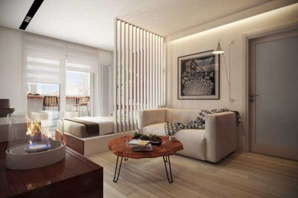 Идеи для однокомнатной квартиры, фотоИнтересный дизайнерский прием зонирования – установка перегородок, которые напоминают жалюзи; такие перегородки хорошо пропускают свет.