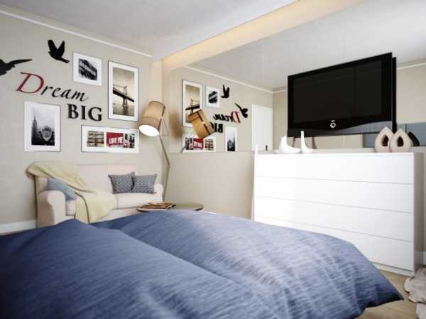 Сочетание белого, серого и теплого бежевого оттенков позволило создать расслабляющую, спокойную атмосферу. Жилая комната имеет две зоны. Возле окна располагается большая кровать, напротив которой над высоким узким комодом установлена ТВ-панель на кронштейне. Ее можно развернуть в сторону небольшой зоны отдыха с диваном и журнальным столиком, акцентированной однотонным напольным ковром бежевого цвета и расположенной в глубине комнаты.