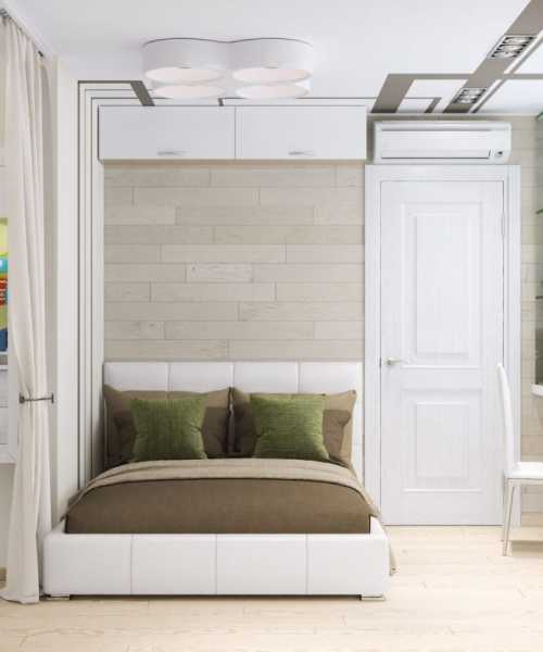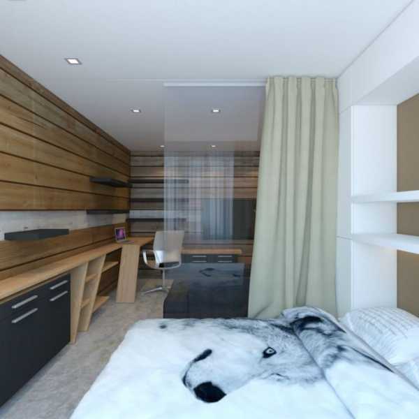 При такой планировке вторым доступным вариантом станет рокировка постели с рабочим местом, но это не совсем верно, т.к. кровать лучше ставить подальше от света, а стол к окну. Третий вариант потребует кардинального подхода — переноса межкомнатной двери, чтобы проход в комнату осуществлялся через кухню.