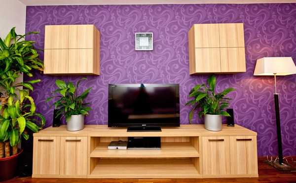 Обращаю ваше внимание, что в данном дизайне имеются недочеты. Например, темный пол — неподходящее решение для узкой вытянутой комнаты. Направление укладки тоже выбрано неверно — все это только еще больше подчеркивает недостатки планировки. Что касается колористической гаммы — возможно, это выбор хозяев, но сделан он явно неудачно. Сиреневые оттенки тяготеют к более дорогим и изысканным предметам обстановки, чем простая мебель в эко-стиле. Вызывают недоумение по-офисному строгий потолочный светильник, уродливый торшер и совковые часы. Больше примеров вы найдете в нашем материале о дизайне зала в различных квартирах .