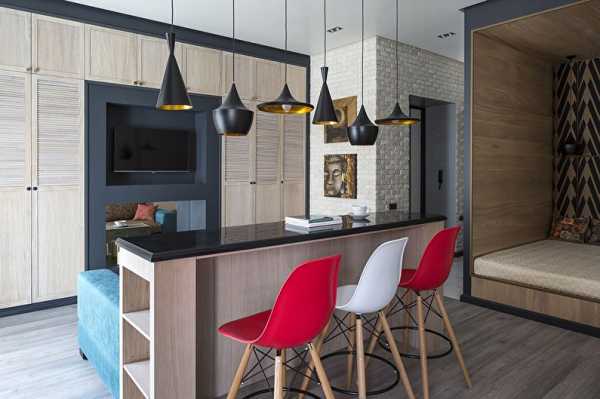Основная идея дизайна однокомнатной квартиры – разделение функциональных зон и их логическое объединение с помощью контрастных цветов спектра: красного, белого и черного.
