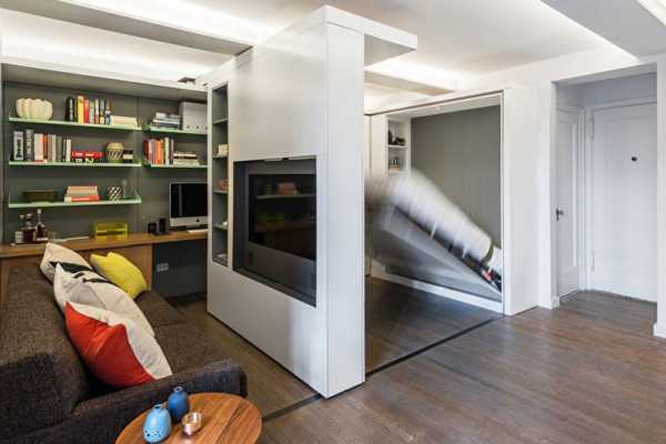 Эта квартира-трансформер способна меняться в зависимости от потребностей ее обитателей. К примеру, в ночное время здесь есть кровать, которая чудесным образом прячется в стену, открывая полноценный гардероб. Но если сдвинуть стену, а также развернуть телевизор, то получается гостиная и удобный рабочий кабинет.