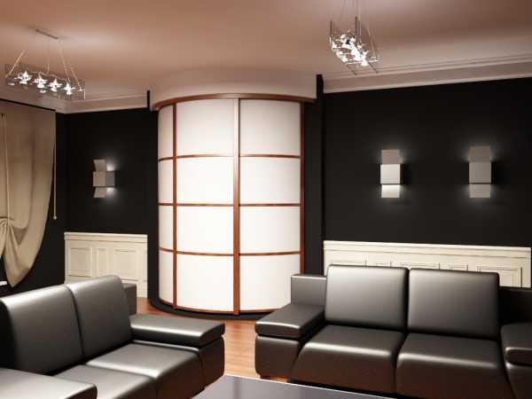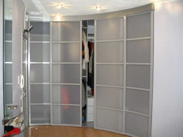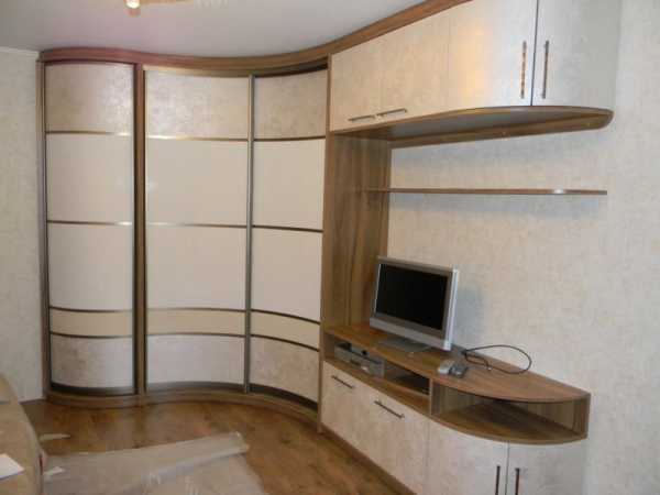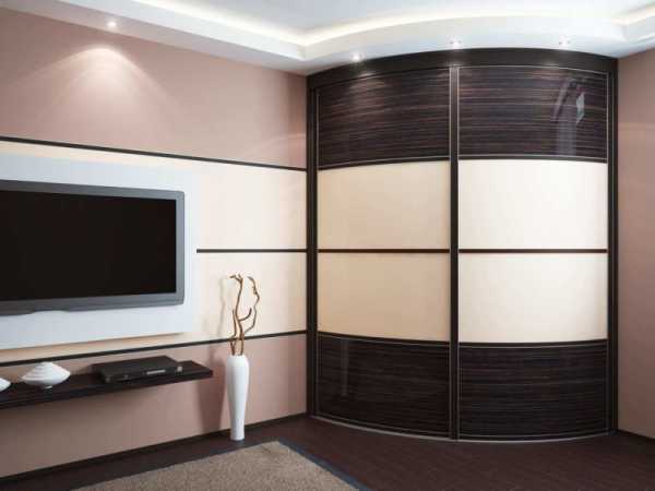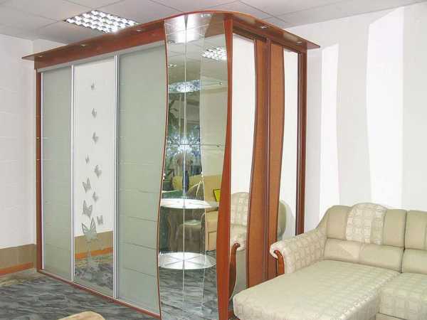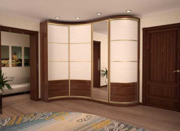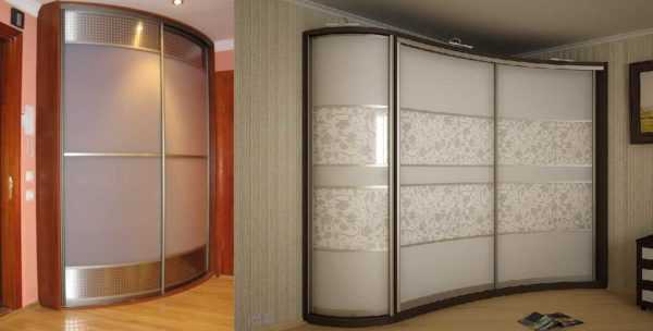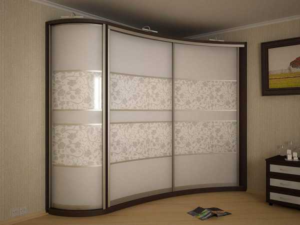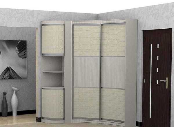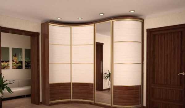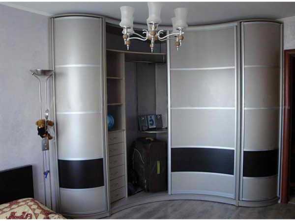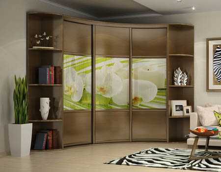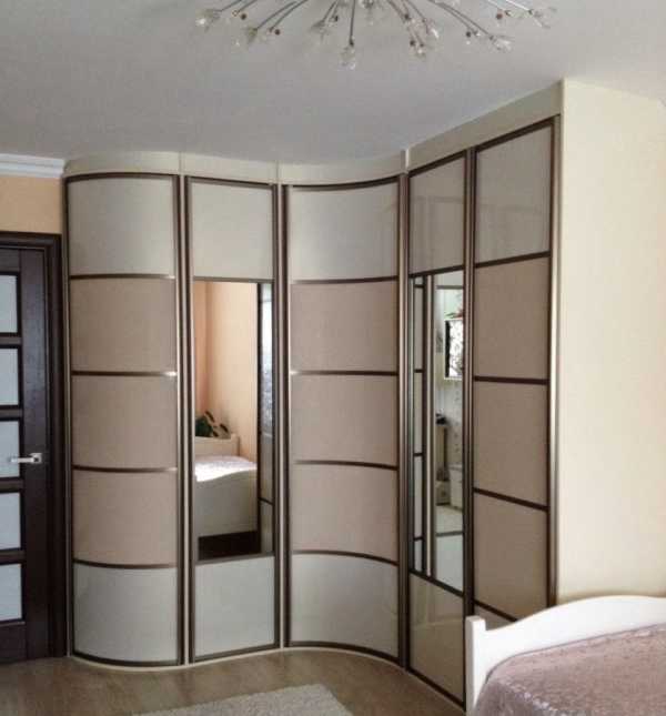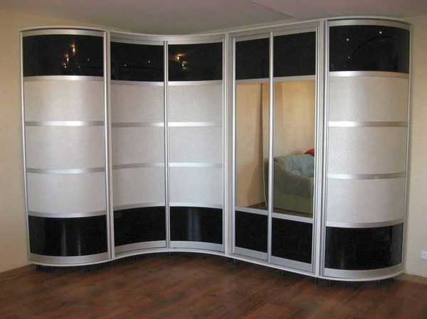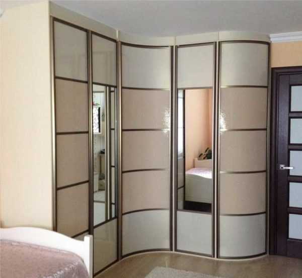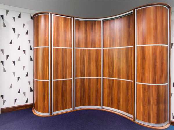 - Радиальные угловые шкафы купе. Так называют те модели, у которых стенки или фасады не ровные, а изогнутые. Такие модели смотрятся более современно, плавные линии