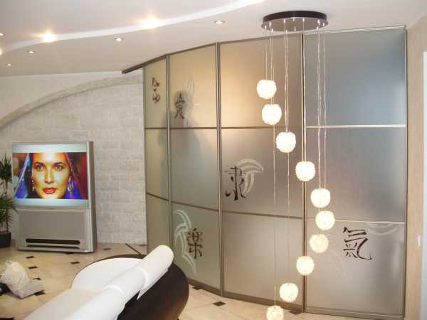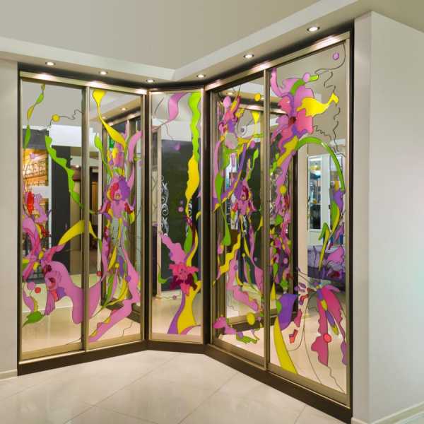 - Стекла (обычно матового, узорчатого, цветного). Стекло используется толстое, каленое. Некоторые фирмы предлагают нанесение какого-то рисунка и на стекле. Обычно есть определенный каталог, из которого можно выбрать понравившееся изображение.