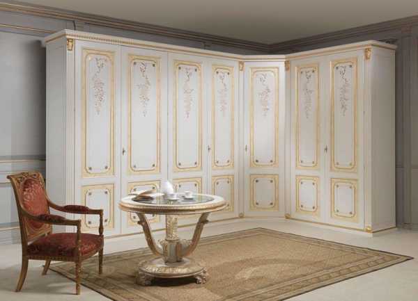 Угловой шкаф с зеркалом, способен принести в интерьер больше света, особенно если он расположен недалеко от оконного проема. Для классического стиля, оптимальным вариантом считается деревянные двери, украшенные резьбой или элементами лепнины.