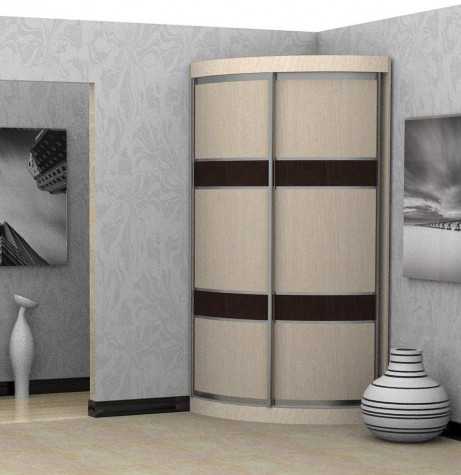 Он считается разновидностью треугольного углового шкафа. К его особенностям относится необычный вид двери, так как она является закругленной. Ее движение обеспечивается за счет установки качественных направляющих.