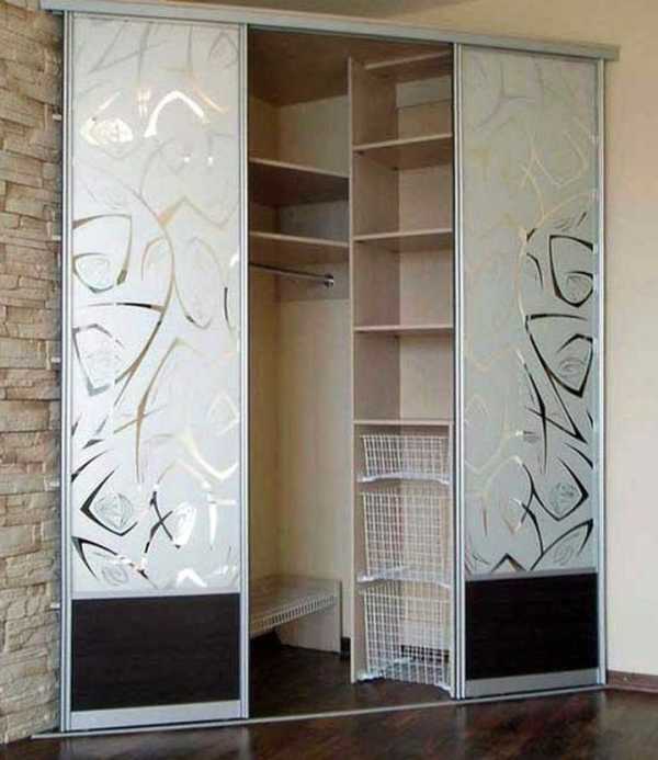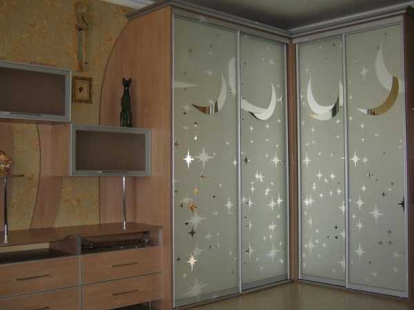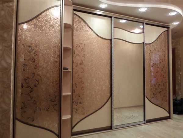 - Комбинации описанных выше материалов и технологий. Наиболее декоративный эффект получается если совместить несколько материалов. Количество комбинаций очень велико и можно подобрать фасад для углового шкафа купе под любой интерьер и вкус.