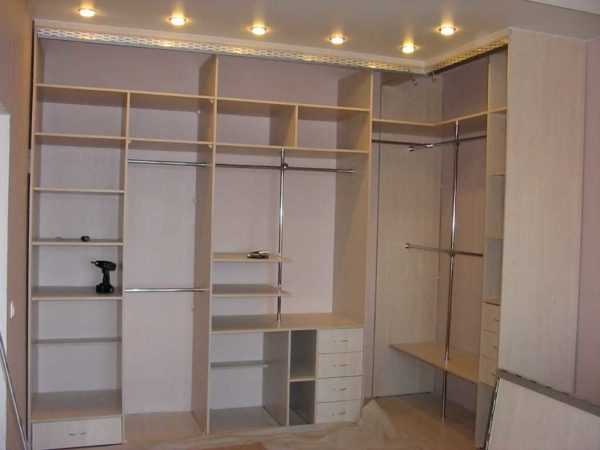 Есть еще одна сложная зона, которую также надо тщательно продумать — прямой угол, образуемый прилегающими стенами. Чаще всего тут располагают отделение для одежды на вешалках (плечиках, тремпелях). Наиболее проблематичная в этом плане конструкция — в виде буквы Г. Если между двумя частями нет перегородки, решается все просто — ставится посередине шест, к нему крепятся перекладины.