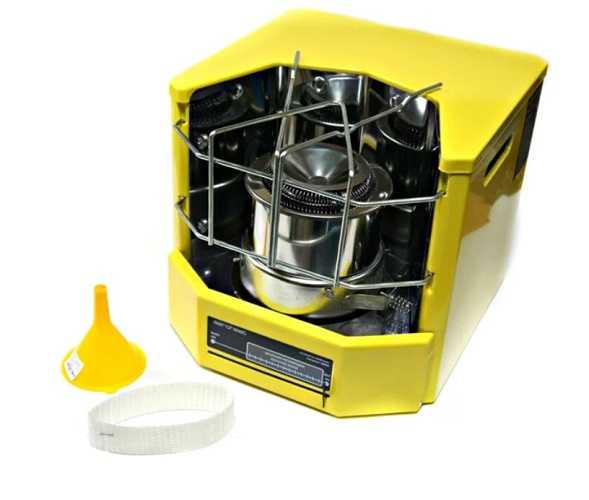 Портативные обогреватели для туризма на жидком топливе имеют одну приятную дополнительную функцию: варочную панель, расположенную вверху устройства. С помощью установки можно приготовить пищу, не разжигая костра, подогреть воду для чая, согреть снасти и одновременно прогреть небольшую палатку.