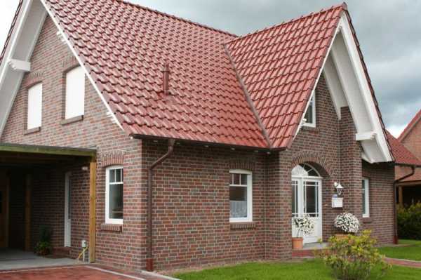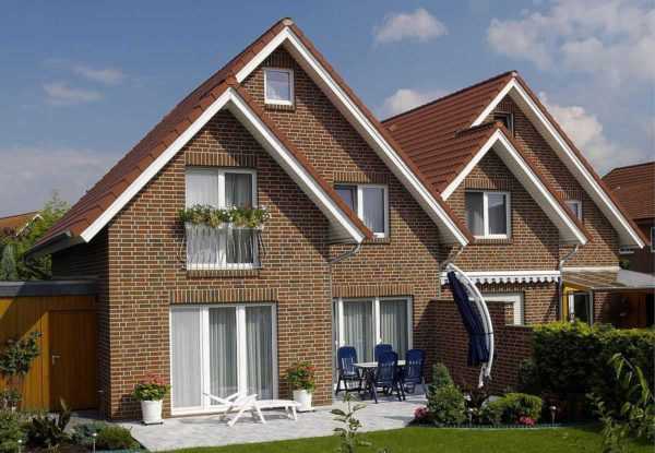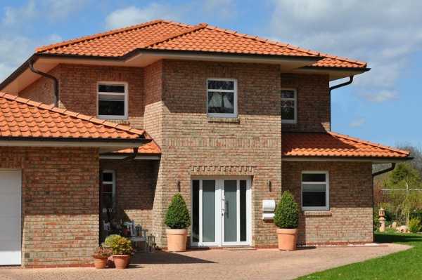 Если посмотреть фото домов из кирпича в европейском стиле, в глаза бросается цоколь, отделанный плиткой или камнем, двух или четырехскатная крыша. Традиционный кровельный материал — натуральная черепица, в последние годы активно вытесняемая металлочерепицей. Окна обычно небольшие, прямоугольной формы, иногда со скругленным верхом. Двери и оконные рамы выполняются в контрастном к цвету стен тоне.