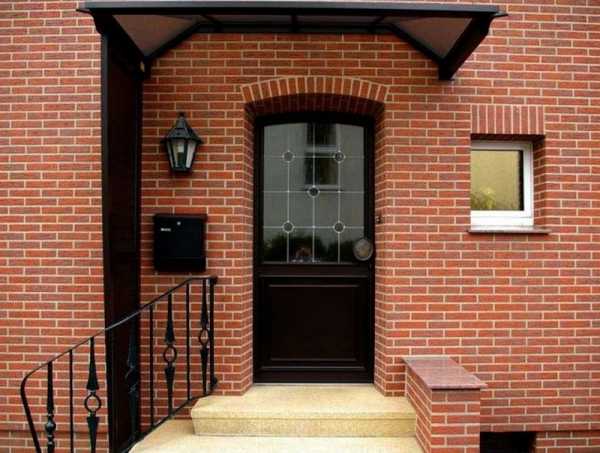 Очень часто кирпичный дом в современном стиле имеет два входа. Парадный может быть вынесен вперед относительно основных стен, над ним делают террасу. В случае если вход «утоплен», над ним делают балкон. В оформлении часто присутствуют кованные изделия, но формы их лаконичны.