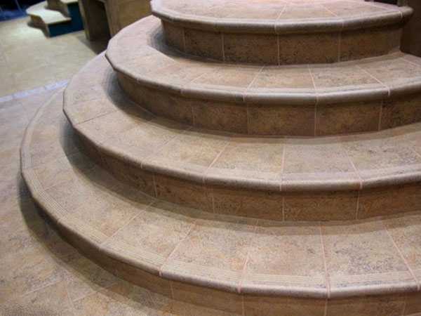 В случае нестандартной, кливолинейной или веерообразной лестницы, имеющей забежные ступени лучше использовать керамогранитную плитку. Монтаж такой плитки лучше производить сразу с бортиками или карнзами. Это уберет вас от дополнительного преобретения профилей и их устройства.