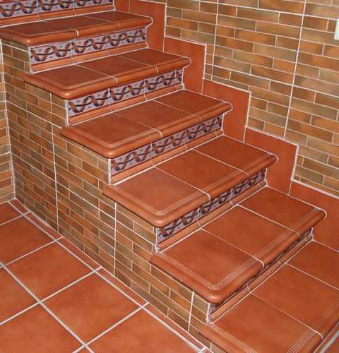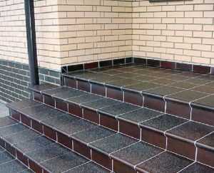 Название клинкерная плитка объединяет в себе несколько товарных позиций, каждая из которых подбирается в том количестве, которое необходимо для реализации проекта лестницы, а именно:- проступь (ступени). Это основная часть, которая выкладывается горизонтально и испытывает максимальную нагрузку при эксплуатации. Стандартная длина составляет 30 см, ширина от 20 до 35 см. Для уличной лестницы толщина плитки должна быть не менее 12 — 15 мм и желательно не очень широкая, так как подвергается серьезной динамической нагрузке. Внешний край имеет небольшой угол разной формы для придания декоративности, защиты от влаги и оформления стыка с подступенком;
